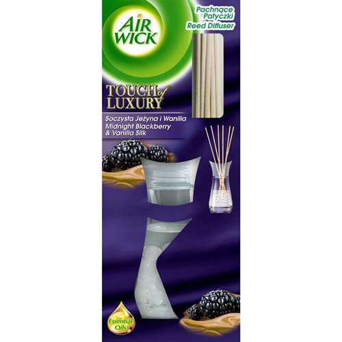 Air Wick Touch of Luxury to pachnące ratanowe patyczki w ozdobnym flakoniku. Pełnia smaku soczystych jeżyn w połączeniu ze słodką wanilią tworzą urzekającą kompozycję zapachową, która sprawi, że każde pomieszczenie w Twoim domu lub pracy będzie pachnieć niesamowitą świeżością. Zapach uwalnia się aż przez 4 tygodnie, a patyczki umieszczone są w eleganckim flakoniku, który upiększy skutecznie każdą powierzchnię. Zapach doskonale sprawdzi się nawet w dużych, przestrzennych pomieszczeniach.