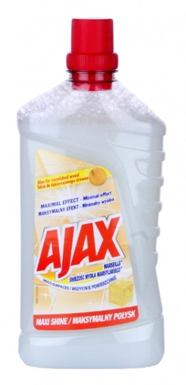 Płyn uniwersalny Ajax doskonale nadaje się do mycia wszelkich powierzchni, takich jak kamień, płytki gresowe i ceramiczne, pcv, linoleum, lastryko. Dodatkowo nadaje połysk czyszczonym powierzchniom, pozostawia świeży zapach mydła marsylskiego.