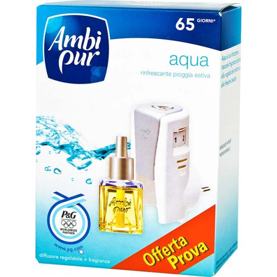 Ambi Pur Aqua elektryczny odświeżacz powietrza. Odświeżacz o przyjemnym, świeżym morskim zapachu. Urządzenie podłączone do prądu lekko się nagrzewa, olejki eteryczne parują pod wpływem ciepła wypełniając całe pomieszczenie przyjemnym aromatem. Odświeżacz wyposażony jest w pierścień którym możemy regulować intensywność zapachu. Jedna buteleczka zapachowa o pojemności 17ml wystarcza na ok. 65 dni (przy użyciu 12 godzin na dobę na pozycji 2). Opakowanie zawiera urządzenie + 1 wkład zapachowy.