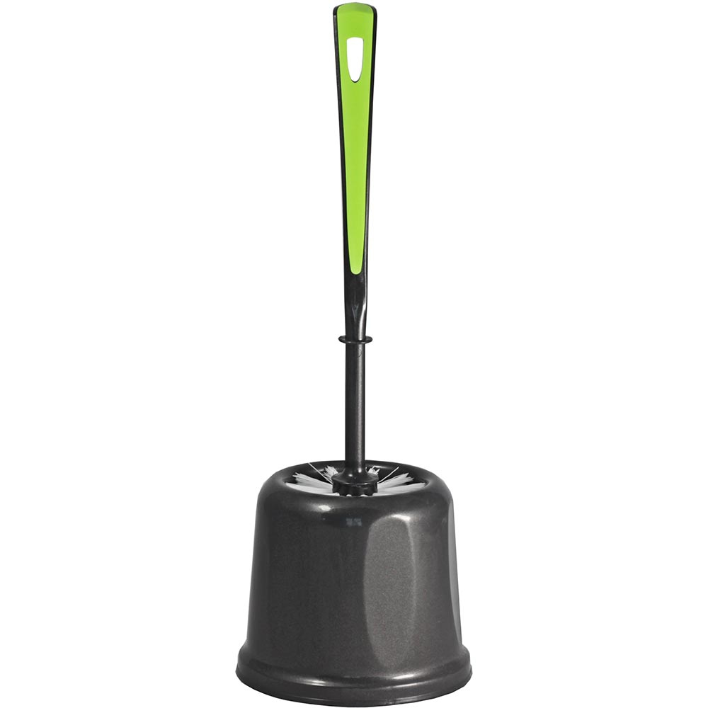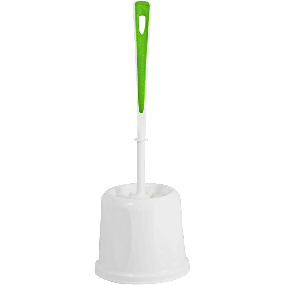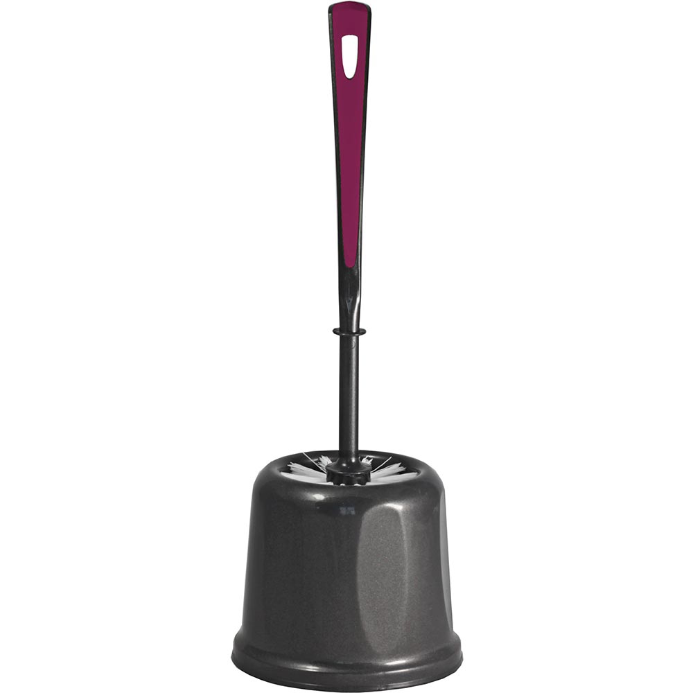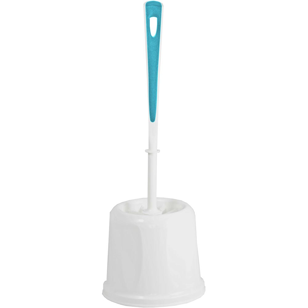 Szczotka do mycia sedesu z solidnego plastiku i wygodna rączka pokryta gumą.