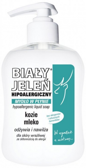 Biały Jeleń mydło w płynie hipoalergiczne kozie mleko. Do codziennej pielęgnacji skóry wrażliwej ze skłonnością do alergii. Skutecznie usuwa zabrudzenia,aktywnie nawilża i wygładza, sprawia że skóra staje się miękka i gładka. Pojemność 300ml.