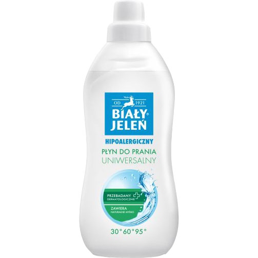 Przed Państwem hipoalergiczny środek piorący w postaci uniwersalnego płynu do prania od marki Biały Jeleń.