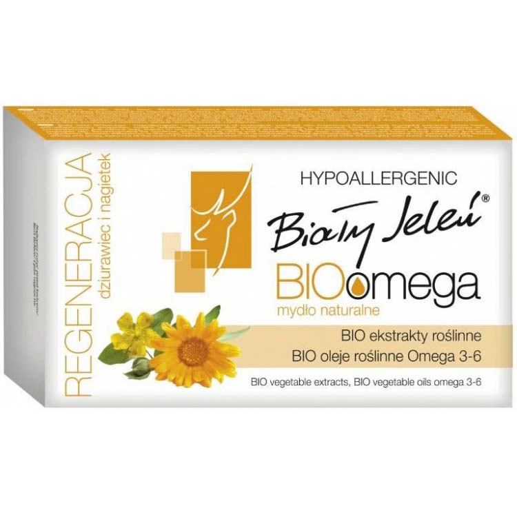 Mydło w kostce Biały Jeleń z serii Bio Omega - Regeneracja. Zawarte w nim naturalne składniki, takie jak wyciągi z ziół czy olejki roślinne, zapewniają skórze higienę oraz odpowiednią pielęgnację. Mydło ma działanie łagodzące oraz przeciwzapalne, posiada także składniki nawilżające skórę.