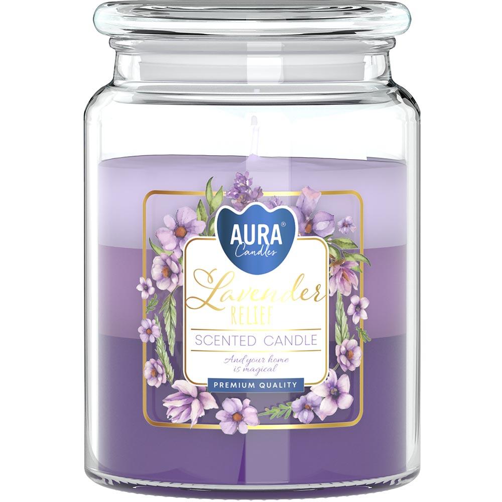 Kompozycja zapachu dużej świecy zapachowej w słoiku z wieczkiem, linii Bispol Aura Lawendowe Ukojenie