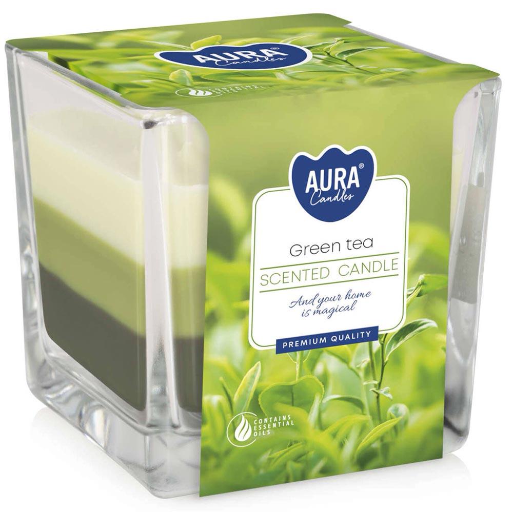 Świeca zapachowa Bispol o zapachu zielonej herbaty. Produkt w estetycznym, kwadratowym, szklanym pojemniku o wymiarach 8cmx8cmx8cm. Świeczka trójkolorowa, co zwiększa jej estetyczność i dopasowanie do wnętrza. Produkt wykonany z parafiny wysokiej jakości, czas palenia wynosi 32 godziny. Zapach długo utrzymuje się w powietrzu. Opakowanie zawiera 1 sztukę