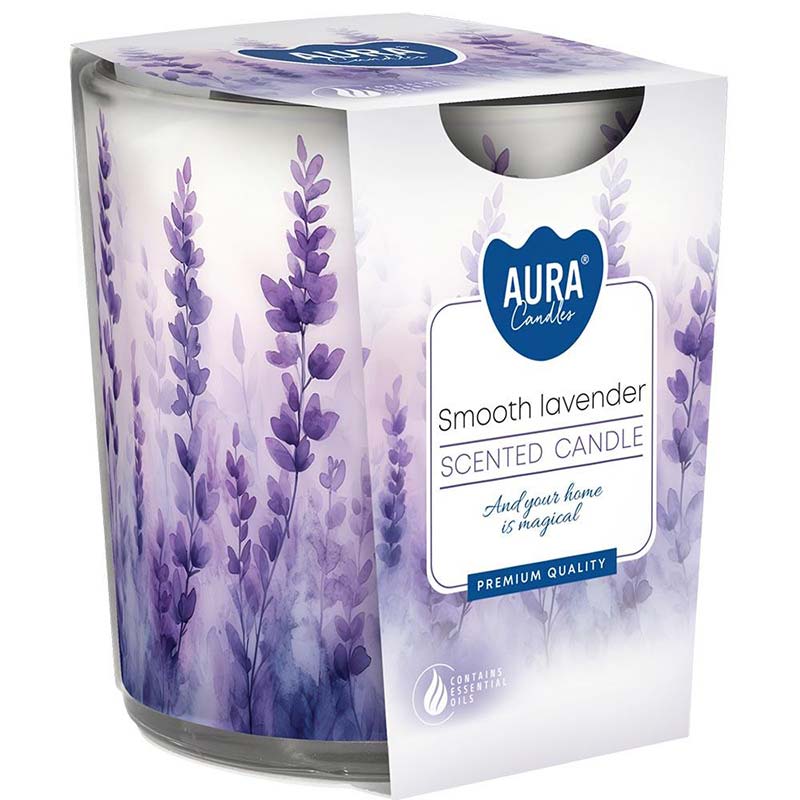 Chcielibyśmy zaproponować Państwu świecę zapachową w prostym szkle z wzorem Aura Delikatna Lawenda, której producentem jest marka Bispol.