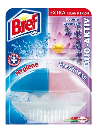 Kostka w płynie Bref Duo Aktiv Lotus i Lavenda ma delikatny zapach lotosu i lawendy. Kostki zapewniają świeżość i higienę. Dzięki obecności chloru produkt ma właściwości wybielające i zapewnia ochronę przed osadzaniem się kamienia. Zawieszka jest wydajna i dopasowuje się do kształtu muszli wc.