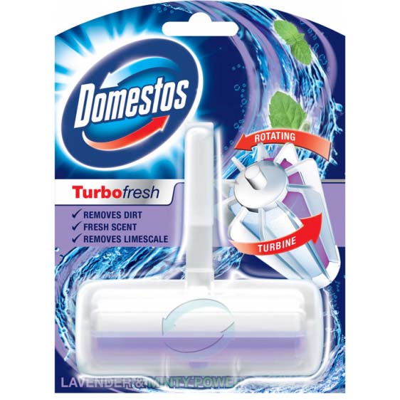 Kostka do WC Domestos Turbo Fresh o pięknym, orzeźwiającym zapachy lawendy i mięty. Przy każdym spłukaniu wody kostka wiruje, dzięki czemu zawarte w niej substancje są jeszcze skuteczniej rozprowadzane wewnątrz toalety. Zapobiega osadzaniu się kamienia na ściankach muszli. Jedna kostka starcza nawet na kilka tygodni.