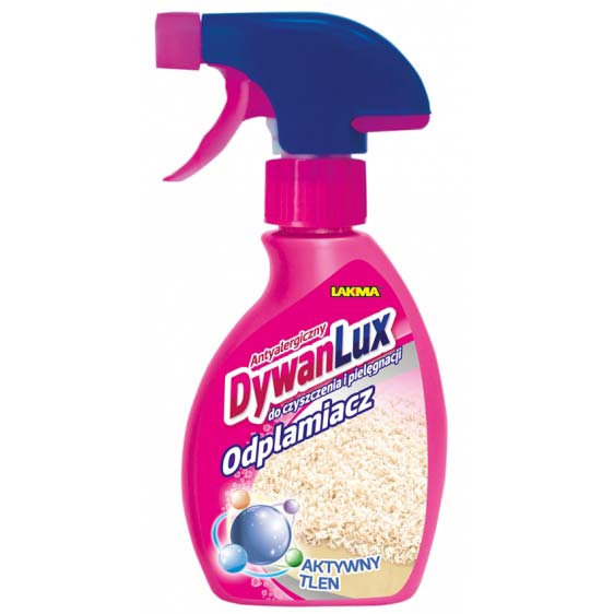 Odplamiacz w sprayu do dywanów i tapicerki. Produkt efektywnie usuwa stary brud, trudne plamy, a także ślady po winie i kawie. Preparat usuwa nieprzyjemny zapach, nadając delikatną i przyjemną nutę. Środek z formułą aktywnego tlenu, co zwiększa jego skuteczność. Preparat jest prosty i wygodny w użyciu, dzięki butelce wyposażonej w atomizer, spray dociera w najmniejsze zakamarki. Odplamiacz nie niszczy materiałów.