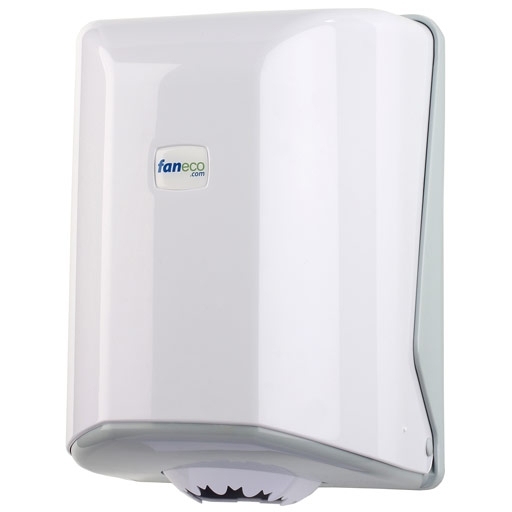 Faneco POP - prosty i estetyczny podajnik do ręczników w roli, wykonany z trwałego, białego plastiku ABS. Wyposażony jest w zamknięcie na kluczyk i okienko kontrolne. Z powodzeniem znajdzie zastosowanie w łazienkach i szaletach obiektów użytku publicznego. Przeznaczony jest na ręcznik o maksymalnej średnicy rolki 20 cm i szeroskości 21 cm, dysponowany od wnętrza zwoju. Produkt charakteryzuje się praktycznością użytkowania, a także doskonałym połączeniem dobrej jakkości oraz przystępnej ceny.