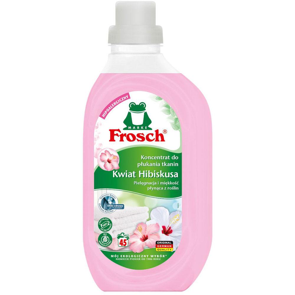 Przed Państwem delikatny, hipoalergiczny środek zmiękczający – skoncentrowany płyn do płukania tkanin Frosch Kwiat Hibiskusa.