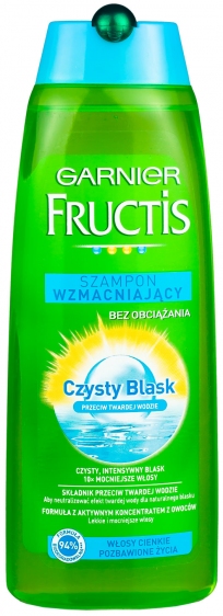 Fructis szampon do włosów Czysty Blask. Przeznaczony do pielęgnacji włosów cienkich, pozbawionych życia. Wzmacnia i odżywia włókno włosa dzięki czemu stają się lekkie, sprężyste i mocniejsze. Stają się gładkie i błyszczące. Dodatkowo zawiera czynnik przeciwko twardej wodzie. Pojemność 250ml.