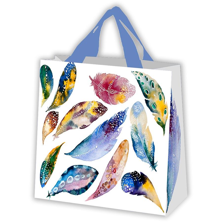 Mamy zaszczyt przedstawić Państwu wysokiej jakości produkt, jakim jest ekologiczna torba wielokrotnego użytku, ze wzorem kolorowych piór.