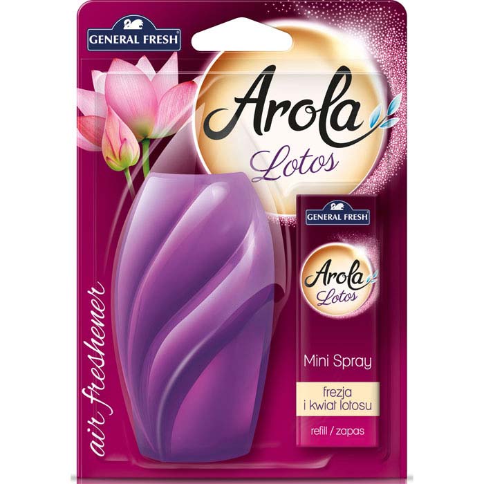 Odświeżacz powietrza Arola w formie mini sprayu o zapachu kwiatu lotosu doskonale sprawdzi się zawsze wtedy, kiedy będziesz chciał pozbyć się nieprzyjemnych zapachów. Możesz go używać zarówno w pomieszczeniach w domu, jak też w samochodzie. Uwolniony zapach utrzymuje się przez długi czas. W zestawie urządzenie z wkładem wymiennym.