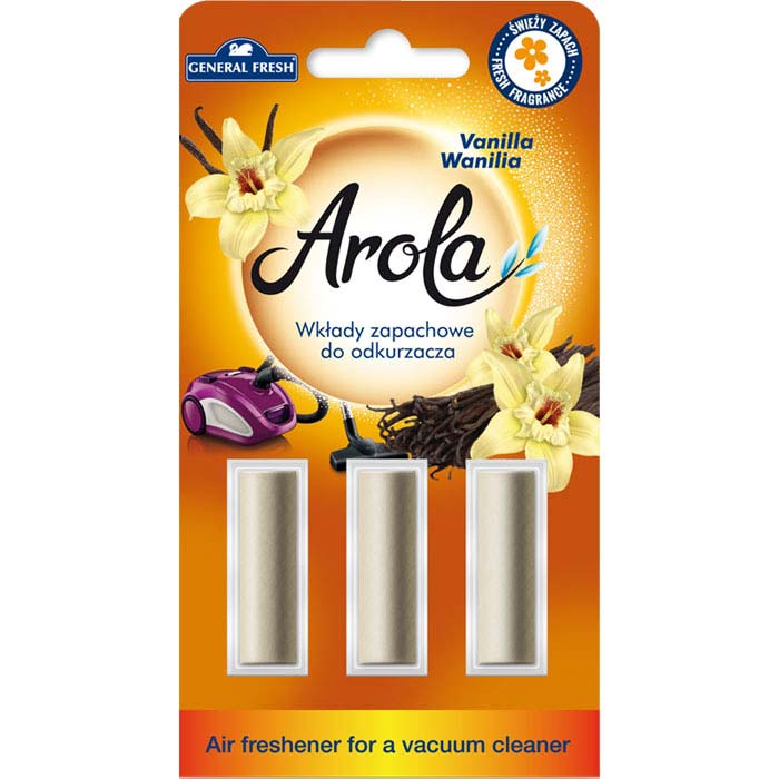 Zapachowe wkłady do odkurzacza Arola o zapachu waniliowym to niezawodny sposób na uprzyjemnienie chwil spędzonych na sprzątaniu. Ich świeży aromat sprawi, że odkurzanie nie będzie już niemiłym obowiązkiem. Zmieniając worek wystarczy umieścić w nim wkład lub po prostu wciągnąć do odkurzacza prez rurę. Później za każdym razem po włączeniu odkurzacza będziesz czuć piękny zapach. Opakowanie zawiera 3 szt.
