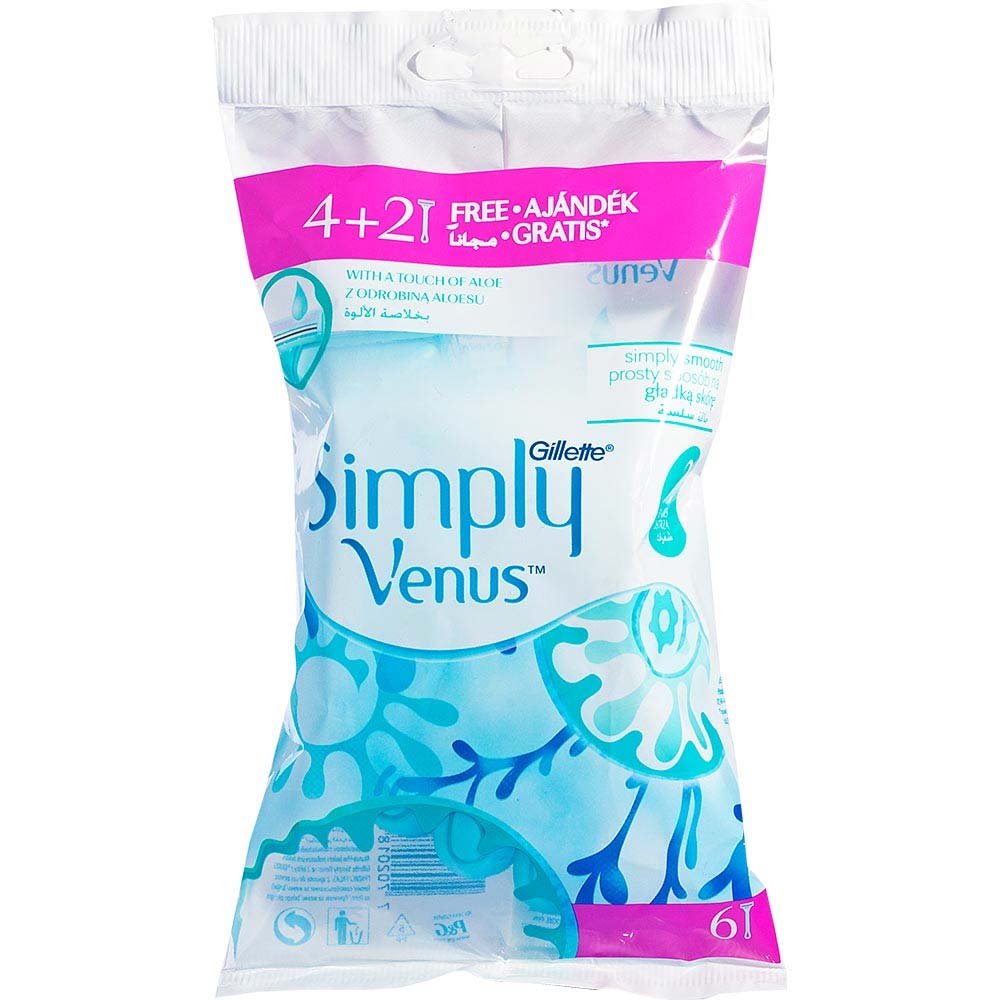 Gillette Simply Venus 2 golarki damskie. Dwa ostrza, nieruchoma główka, pasek nawilżający i doskonale wymodelowana rączka zapewniają komfortowe i gładkie golenie oraz stabilny uchwyt. Opakowanie zawiera 4 sztuki + 2 GRATIS.