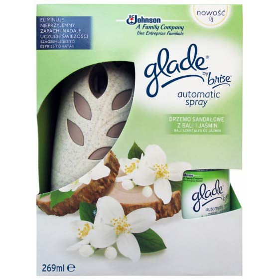 Automatyczny odświeżacz powierza Glade by Brise o zapachu drzewa sandałowego z Bali i jaśminu. Urządzenie zasilane bateriami z wymiennym wkładem. Zwalcza nieprzyjemne zapachy i wypełnia pomieszczenia świeżością. Możliwość wyboru z trzech częstotliwości wydzielania zapachu (co 9, 18 lub 36 minut).