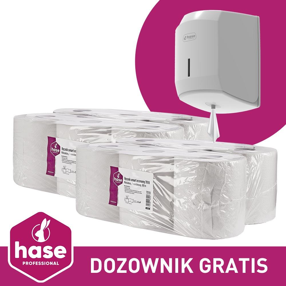 w skład pakietu wchodzą dwa opakowania (12 rolek) ręcznika papierowego Hase Smart 7018 - makulatura, jednowarstwowy o długości 300 metrów oraz podajnik GRATIS!