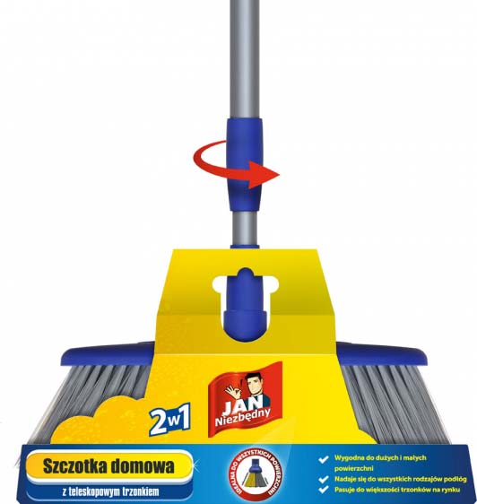 Dedykowana do sprzątania pomieszczeń, nowoczesna, domowa szczotka 2w1 Jan Niezbędny, oferowana wraz z teleskopowym trzonkiem, który znacznie poprawia komfort pracy oraz ułatwia przechowywanie szczotki. Produkt charakteryzuje się także podwójnym rodzajem włosia - po jednej stronie mocniejsze i grubsze, a po drugiej delikatniejsze i postrzępione, pozwalające na dokładne zamiatanie kłębków kurzu i pyłków.