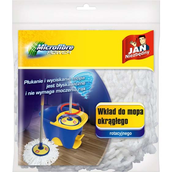 Wymienny wkład, przeznaczony do nowoczesnego mopa rotacyjnego Jan Niezbędny, zaprojektowany tak, aby usuwać nawet najdrobniejsze zabrudzenia z różnych powierzchni. Wykonany z bardzo chłonnej mikrofibry, która nie pozostawia smug podczas sprzątania. Doskonale się odsącza, dzięki specjalnemu mechanizmowi rotacyjnemu. Nie wymaga moczenia rąk i schylania się, a sprzątanie przebiega wyjątkowo wygodnie. Czyści panele, parkiet, sztuczne wykładziny oraz terakotę.