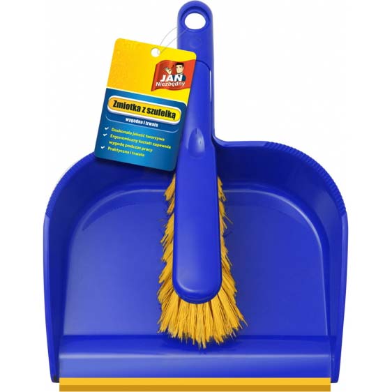 Zmiotka z szufelką Jan Niezbędny. Komplet zrobiony z wytrzymałego i mocnego tworzywa sztucznego o niebieskiej barwie. Produkt o ergonomicznym kształcie, co zwiększa wygodę i szybkość sprzątania. Zmiotka posiada nylonowe włosie, dokładnie zamiata kurz i okruszki. Szufelka wyposażona w gumowe zakończenie, które ułatwia zebranie zabrudzeń.