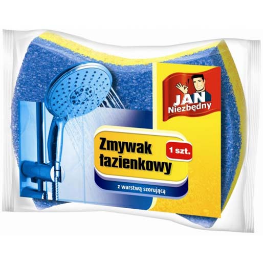 Zmywak Jan Niezbędny do łazienki. Produkt wykonany z trwałej i chłonnej gąbki z warstwą szorującą do silnych zabrudzeń. Zmywak przeznaczony do mycia brudu, osadów i zacieków na prysznicach, wannach, umywalkach, a także armaturze łazienkowej. Gąba o ergonomicznym kształcie ułatwia sprzątanie. Kolor niebiesko-żółty.