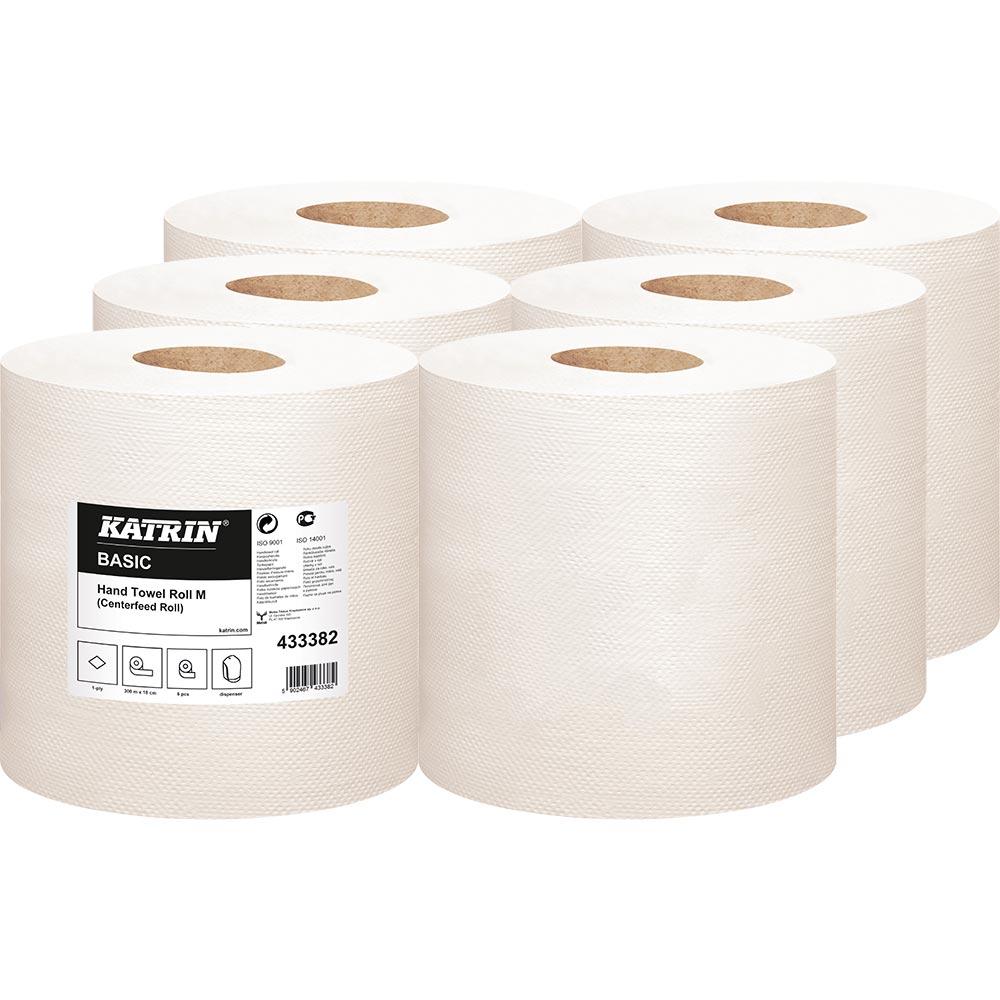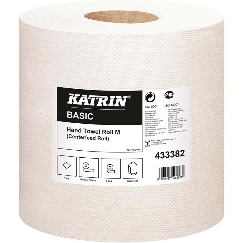 Katrin Basic 433382 ręcznik Maxi standardowej jakości makulaturowy ręcznik higieniczny. Charakteryzuje się dużą szybkością wchłaniania i wysoką wytrzymałością zapewniając skuteczne osuszanie rąk. Produkt posiada certyfikaty ISO9001 oraz ISO14001. Ręcznik jednowarstwowy o długości 300 m w kolorze białym. W opakowaniu znajduje się 6 rolek.