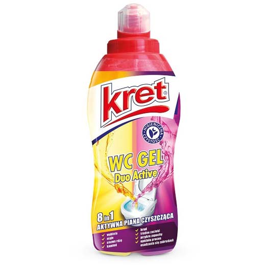 Czysta toaleta to doskonała wizytówka każdego domu. By doprowadzenie toalety do idealnego stanu nie zajmowało Ci wielu godzin, używaj żelu do WC Kret Duo Active. Preparat nie tylko usuwa z powierzchni muszli zabrudzenia, ale również wybiela ją i pozostawia lśniącą. Wytwarza tarczę ochronną, która zapobiega ponownemu powstawaniu osadów.