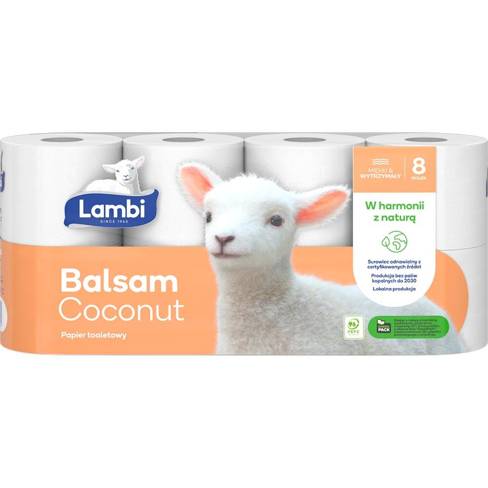 Poznaj Lambi Balsam Coconut. To miękki papier toaletowy wzbogacony o balsam mleczka kokosowego.