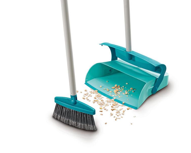 Producent Leifheit w swoim asortymencie posiada między innymi komplet do zamiatania, składający się ze szczotki z drążkiem oraz automatycznie zamykanej szufelki.