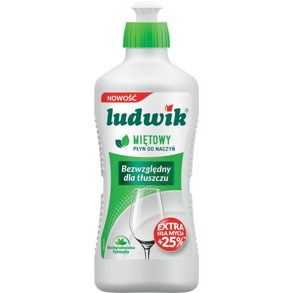 Miętowy płyn do mycia naczyń Ludwik. Produkt gęsty i dobrze pieniący się, co zwiększa wydajność preparatu. Środek efektywnie likwiduje trudne zabrudzenia i zaschnięty tłuszcz z naczyń i sztućców, nabłyszcza je bez nieestetycznych smug i zacieków. Preparat przebadany dermatologicznie, jest łagodny dla skóry dłoni. Płyn biodegradowalny, można go stosować w ciepłej oraz zimnej wodzie. Środek umieszczony w  poręcznej butelce.