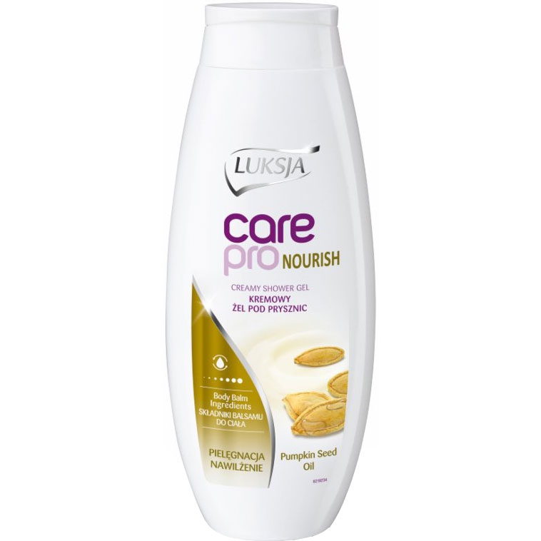 Mleczko pod prysznic Luksja Care Pro Nourish z olejem z pestek dyni to gwarancja długotrwałej świeżości. Jego główną zaletą są właściwości oczyszczające. Od zwykłych żeli pod prysznic odróżnia je to, że zawiera składniki balsamu do ciała. Dzięki temu działa nawilżająco, zmiękcza skórę i nadaje je jedwabistą gładkość. Pojemność 500 ml.