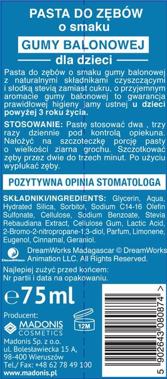 Atutem opisywanej pasty jest nie tylko jej skuteczność i delikatność, ale również barwne opakowanie, przedstawiające wesołe zwierzaki z animowanego filmu Madagaskar, który skradł serca wielu dzieci.