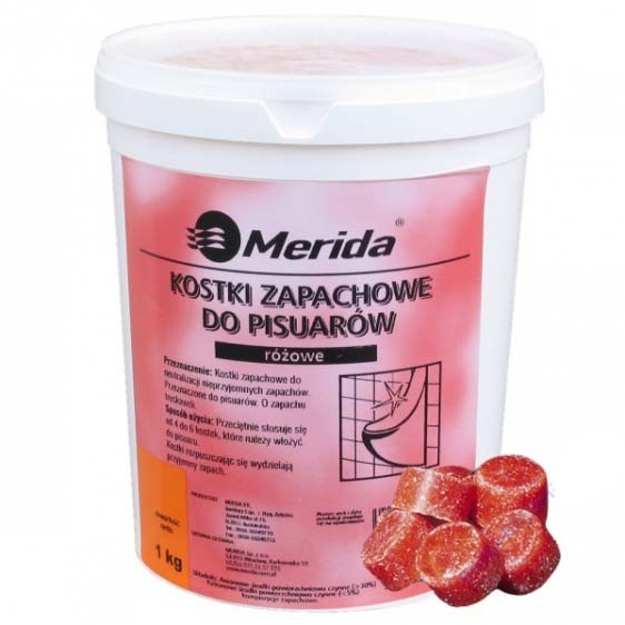 Merida kostki zapachowe do pisuarów doskonale neutralizują przykre zapachy, a także dezynfekują obszar przyodpływowy. Zazwyczaj stosuje się 4-6 kostek do jednego pisuaru. Opakowanie 1kg zawiera ok. 35 szt. kostek. Zapach truskawkowy.