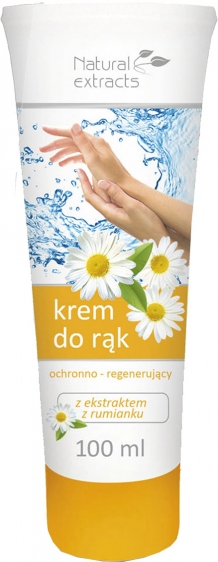 Natural Extracts krem do rąk ochronno-regenerujący z wyciągiem z rumianku delikatnie natłuszcza skórę likwidując jej szorstkość, nawilża oraz łagodzi podrażnienia. Posiada lekką konsystencję, dzięki czemu dobrze się wchłania. Pojemność 100ml.