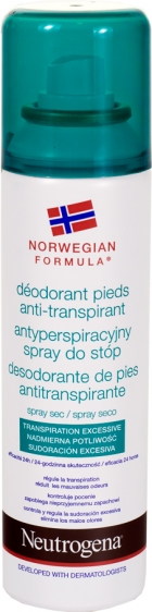 Warto zapewnić sobie świeżość stóp przez cały dzień, a nie ma do tego lepszego narzędzia, niż antyperspirant do stóp Neutrogena. Formuła Norweska antyperspirantu o długotrwałym działaniu chroni stopy, zapewnia świeżość i suchość pozwalając stopom oddychać. Receptura antyperspirantu zmienia się w puder szybko wchłaniający wilgoć, dzięki czemu możliwa jest dokładna kontrola pocenia i eliminacja każdego przykrego zapachu.