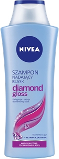 Nivea szampon do włosów Diamond Gloss. Polecany do włosów matowych pozbawionych blasku. Sprawia, że włosy mienią się diamentowym blaskiem, łagodnie myje i pielęgnuje włosy, pozostawia włosy miękkie i gładkie w dotyku. Pojemność 250ml.