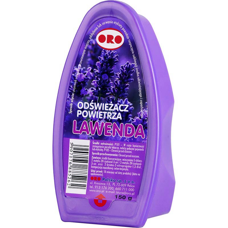 Odświeżacz powietrza w żelu to jeden z najprostszych sposobów na wypełnienie pomieszczeń przyjemnym zapachem i zneutralizowanie tych brzydkich. Wśród szerokiego asortymentu odświeżaczy ORO znajduje się ten o zapachu lawendowym. Produkt jest bardzo prosty w użyciu – wystarczy zerwać etykietę i postawić go w przewiewnym miejscu. Opakowanie zawiera 150g.