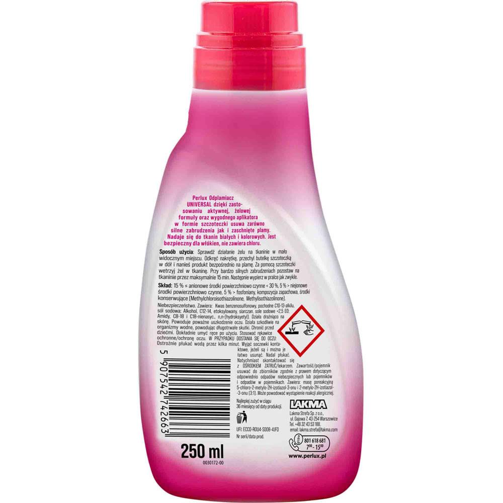 Perlux odplamiacz do tkanin nadaje się do usuwania uporczywych plam z każdego rodzaju pranej odzieży. Jego aktywna formuła zwiększa skuteczność w usuwaniu silnych, zaschniętych plam. Jest bezpieczny dla tkanin jak i w użyciu, ponieważ nie zawiera och chloru, który wpływa na ich uszkodzenie. Żelowa konsystencja odplamiacza zwiększa jego wydajność oraz sprawia, że jego stosowanie jest znacznie wygodniejsze. Posiada ergonomiczny aplikator w formie miękkiej szczotki, która dociera do trudno dostępnych miejsc takich jak kołnierzyki czy mankiety.