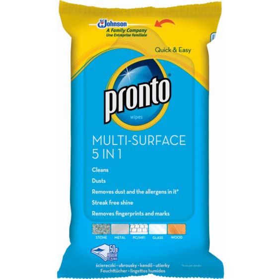 Ściereczki nawilżone Pronto Multi-Surface 5w1 idealnie nadają się do przecierania powierzchni drewnianych, szklanych, metalowych, plastikowych oraz do kamienia. Z łatwością likwidują zabrudzenia, ale przede wszystkim są pogromcą kurzu. Usuwają go i chronią meble przed jego ponownym osadzaniem. Chusteczki o przyjemnym, cytrynowym zapachu.