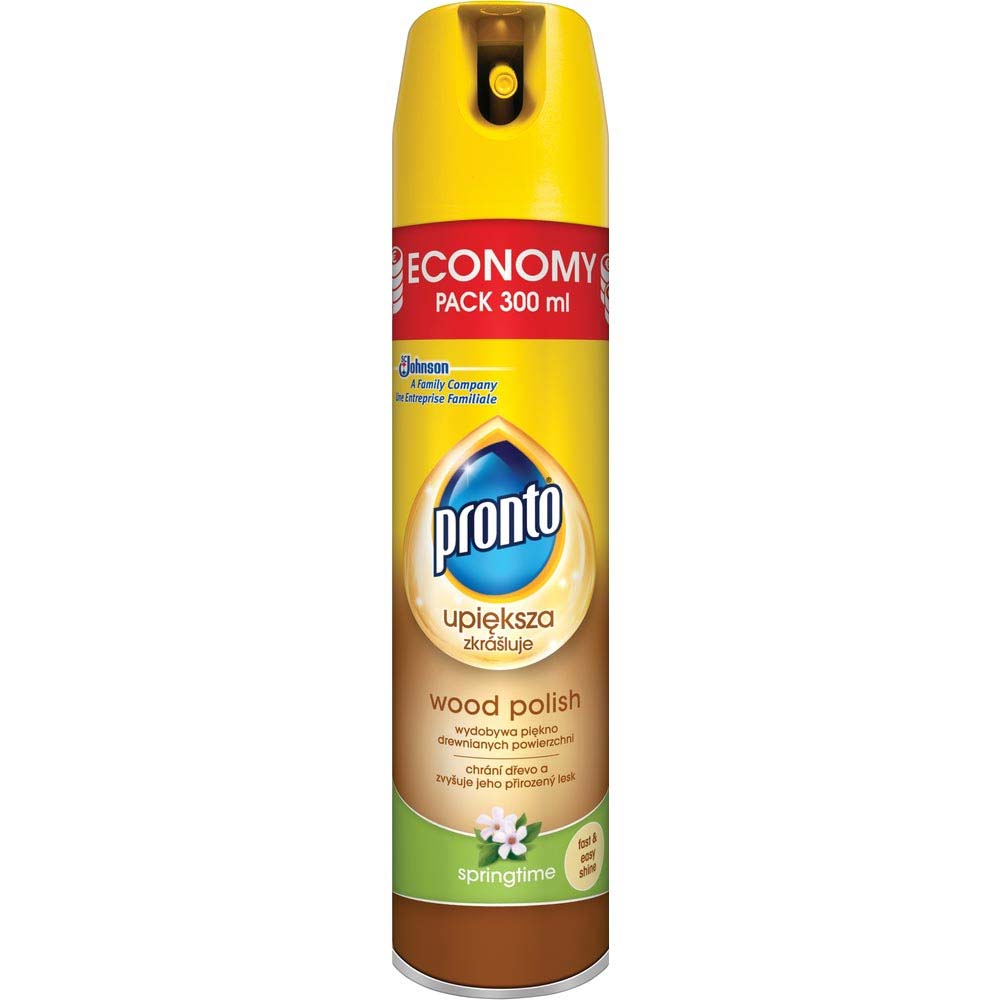 Z aerozolem do powierzchni drewnianych Pronto Springtime sprzątanie będzie łatwe i przyjemne. Wystarczy, że spryskasz meble preparatem i wytrzesz suchą ściereczką. W ten sposób pozbędziesz się kurzu na długi czas, ponieważ spray Pronto zapobiega jego ponownemu osiadaniu. Dodatkowo nadaje powierzchniom połysk i zostawia piękny, kwiatowy zapach.