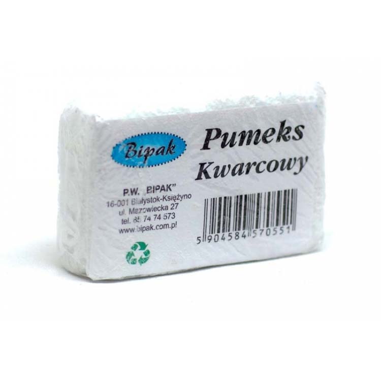 Pumeks kwarcowy biały o średniej porowatości. Idealnie nadaje się do czyszczenia skóry dłoni oraz zabiegów ścierających (usuwanie zrogowaciałego naskórka z pięt). Każda kostka jest pakowana osobno w folię. Wymiary: 8 x 5 x 2 cm.