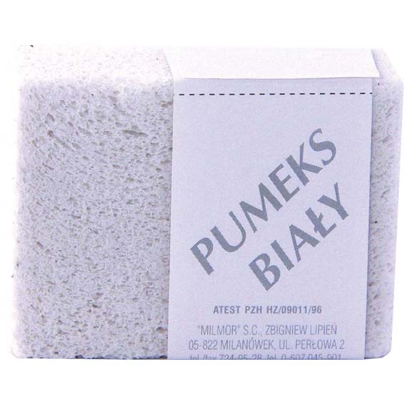 Pumeks szorski biały o twardej i kruchej strukturze. Doskonale nadaje się do czyszczenia skóry dłoni z mocnych zabrudzeń oraz usuwania grubego, zrogowaciałego naskórka. Wymiary: 8 x 6 x 2 cm.