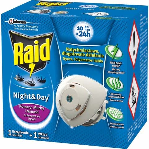 Nie ma chyba nic bardziej irytującego, niż komary i muchy latające nad uchem. Zapewnij sobie spokój od tych denerwujących szkodników z urządzeniem Raid Electric Night & Day. Urządzenie z wkładem zapewnia całodobową ochronę przed komarami i muchami i działa nieprzerwanie aż przez 10 dni. Jest dyskretne, nie rzuca się w oczy, a jego zapach jest dla człowieka całkowicie niewyczuwalny.