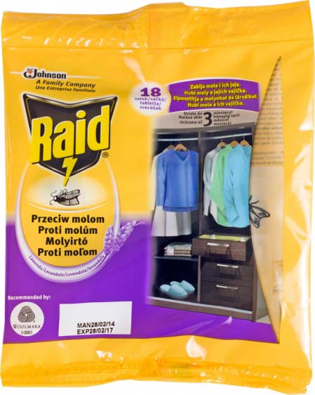Raid kulki przeciw molom o przyjemnym zapachu lawendy. Chronią przed molami i jch jajami do 3 miesięcy. Kulki stopniowo uwalniają substancję czynną zapobiegając aktywności owadów. Kulki są bezpieczne dla tkanin nie niszczą ich ani nie pozostawiają śladów.