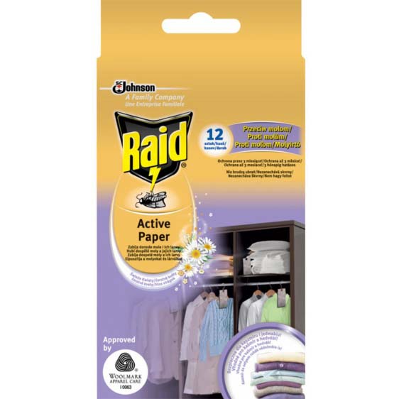 Raid papier przeciw molom o przyjemnym zapachu lawendy. Chroni przed molami i jch larwami do 3 miesięcy. Stopniowo uwalnia substancję czynną zapobiegając aktywności owadów. Środek bezpieczny dla tkanin nie niszczy ich ani nie pozostawia śladów.