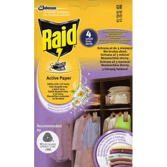 Raid papier przeciw molom o przyjemnym zapachu lawendy. Chroni przed molami i jch larwami do 3 miesięcy. Stopniowo uwalnia substancję czynną zapobiegając aktywności owadów. Środek bezpieczny dla tkanin nie niszczy ich ani nie pozostawia śladów.