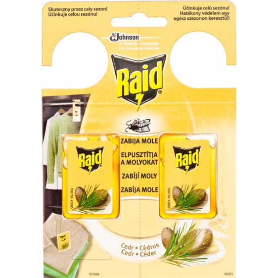 Nie musisz dłużej obawiać się o stan Twoich ubrań. Zawieszka cedrowa przeciw molom Raid sprawi, że mole nie będą zagrażać zniszczeniem Twojego ulubionego płaszczu czy swetra. Zawieszka ma olej cedrowy, który wykazuje silne działanie odstraszające mole. Zawieszka wykazuje się długotrwałym działaniem, skutecznie pozbędzie się moli przez cały sezon.