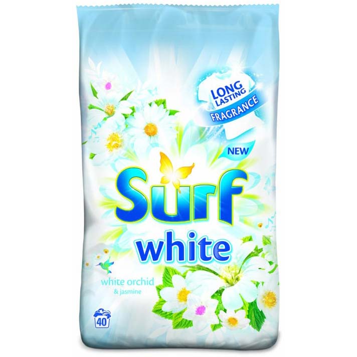 Proszek do prania Surf to idealny środek do walki z najtrudniejszymi zabrudzeniami. Zawiera substancje wybielające i odplamiające, które nie niszczą tkanin i chronią je przed ponownym osadzaniem się brudu. Zapach białej orchidei i jaśminu doskonale komponuje się ze świeżością i nieskazitelną bielą wypranych ubrań. Opakowanie 2,8 kg.