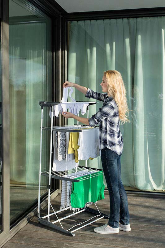 Ponadto suszarka odporna jest na działanie czynników atmosferycznych, dzięki czemu możesz wystawić ją na balkonie lub na podwórko.